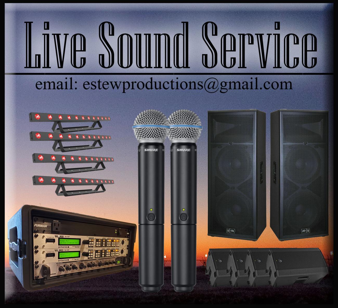 Full band system includes four Mackie Thump floor monitors, four Shure vocal mics (two are wireless), four DI boxes, three instrument mics, Audix 7-piece drum mic package, and 100 ft. balanced lines to a PreSonus StudioLive 24.4.2 mixer with vocal processing rack. Out to the audience: Peavey SP4 main speakers (3-ways) powered by a 2,700 watt Crown XLi 3500 amplifier. (class AB)